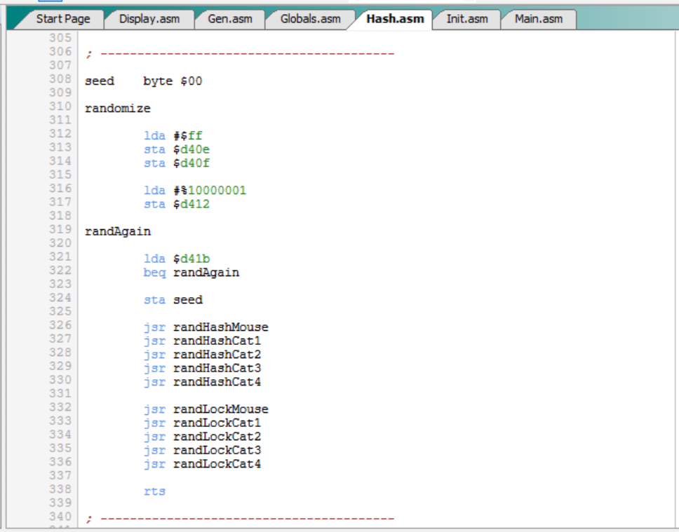 Pues bien, la nueva rutina “randomize” hace todo lo anterior y, además, inicializa las tablas “lock_mouse” y “lock_catN” con valores aleatorios mediante el uso de unas nuevas rutinas auxiliares “randLock*”: