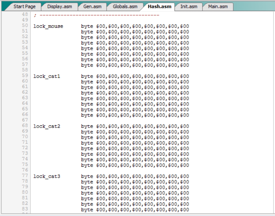 La nueva rutina “getLock” es totalmente equivalente a “getHash”, es decir, inicializa el lock a cero y recorre el tablero localizando piezas (ratón o gatos), en función de las cuales consulta las posiciones análogas de las tablas aleatorias (“lock_mouse” y “lock_catN”), haciendo el OR exclusivo (“eor”) de esos valores. El resultado es el lock del tablero.