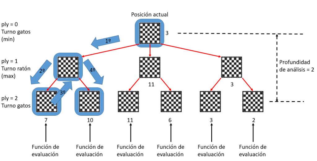 La función de evaluación es una rutina que recibe un tablero (tablero “board”) y devuelve un número que nos indica cómo de bueno o malo es ese tablero para ratón y gatos. Se aplica sobre las hojas del árbol de juego, y luego esas evaluaciones se hacen subir por el árbol aplicando minimax, es decir, calculando el máximo o el mínimo en función del bando que mueve: