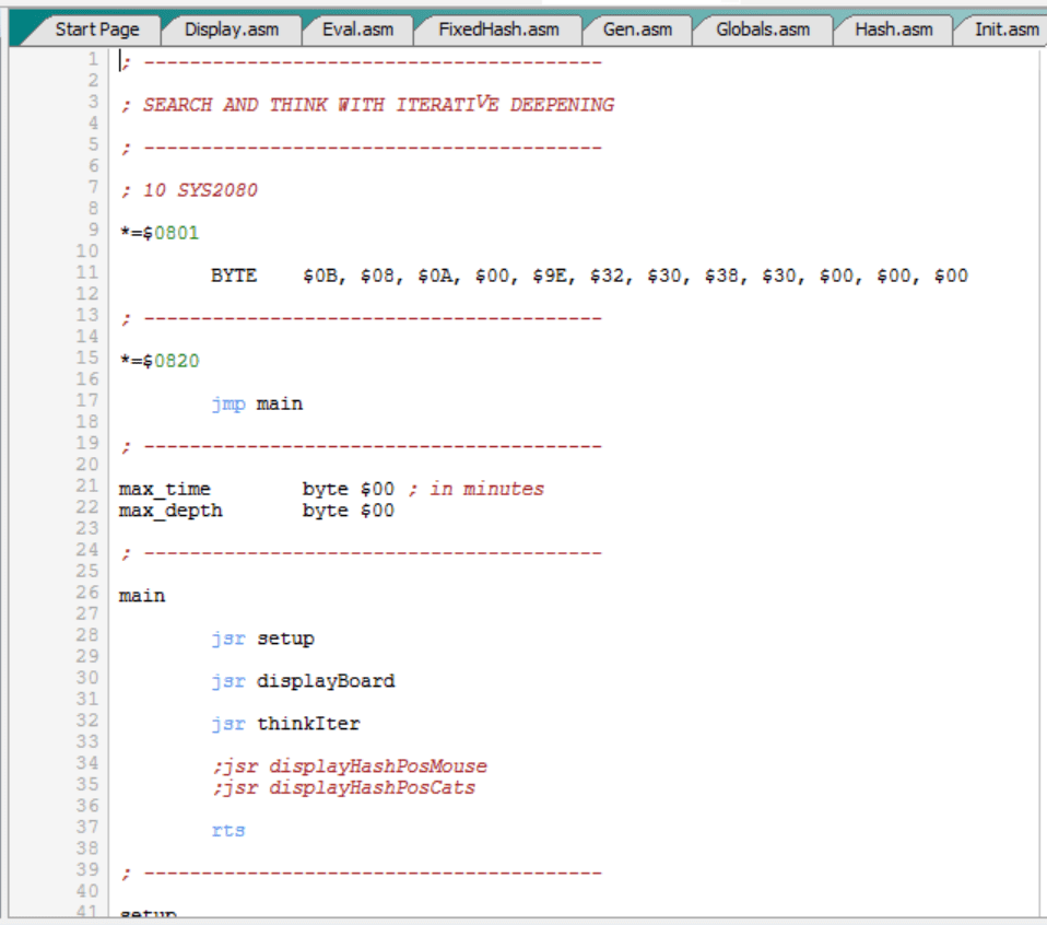 - Ejecuta un bucle desde X = 0 hasta X = max_depth – 1. Para cada valor de X, llama a la rutina “search” con depth = X+1, alpha = $00 y beta = $ff. También llama a displayIter.