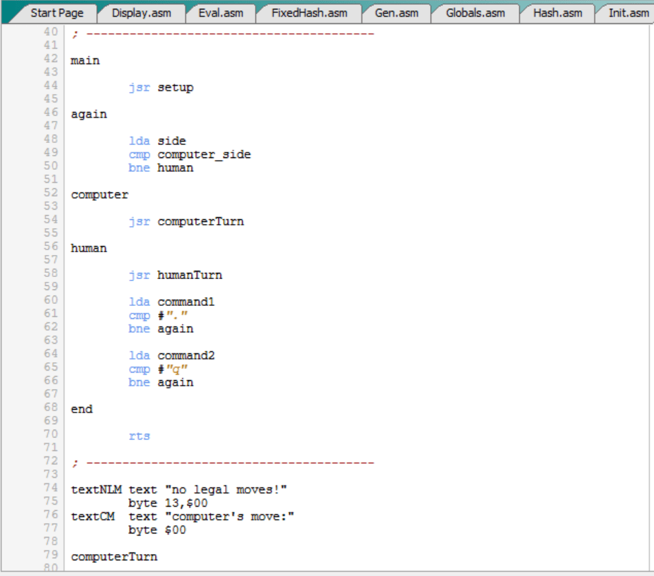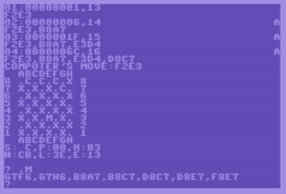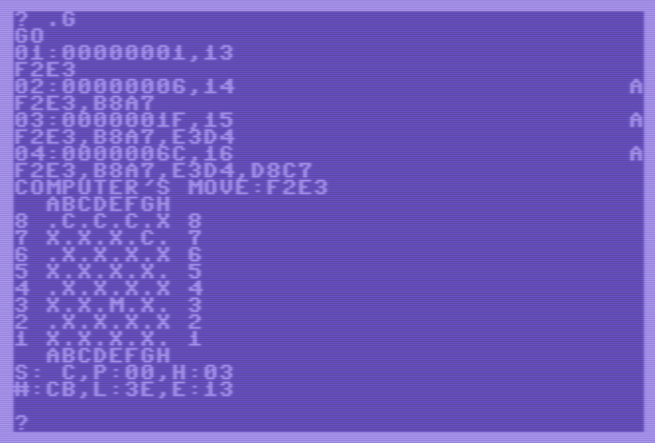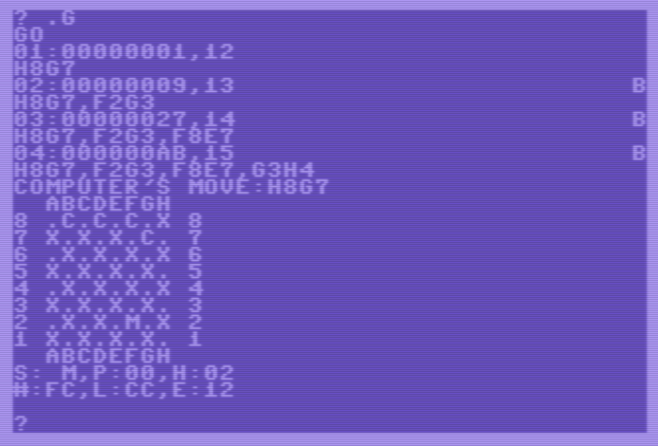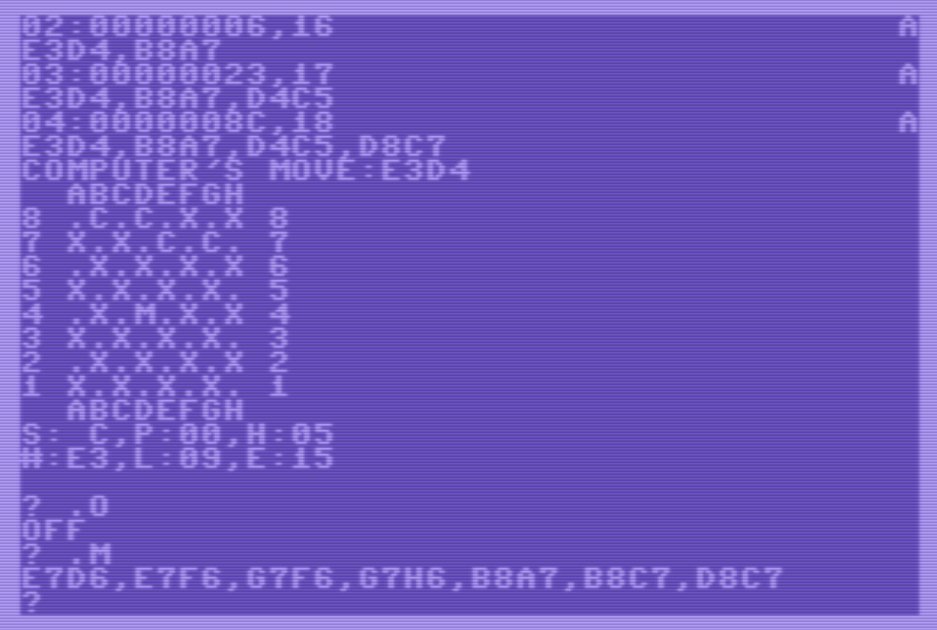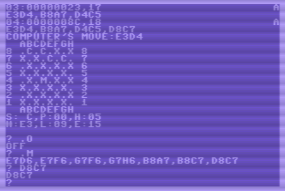 - El punto anterior tiene un caso especial, que es cuando “computer_side” vale #PIECE_EMPTY, que es su valor inicial. Esto significa que el C64 de momento está parado, que no juega ni por el ratón ni los gatos. En este caso, es imposible que “side” y “computer_side” sean iguales, puesto que “side” sólo puede valer ratón o gatos, así que en este caso siempre se ejecuta “humanTurn”. Es decir, cuando el motor está parado sólo puede mover o ejecutar comandos el humano. Todo ello hasta que se arranque el motor con el comando “.G”, que básicamente lo que hace es darle un valor a “computer_side”.