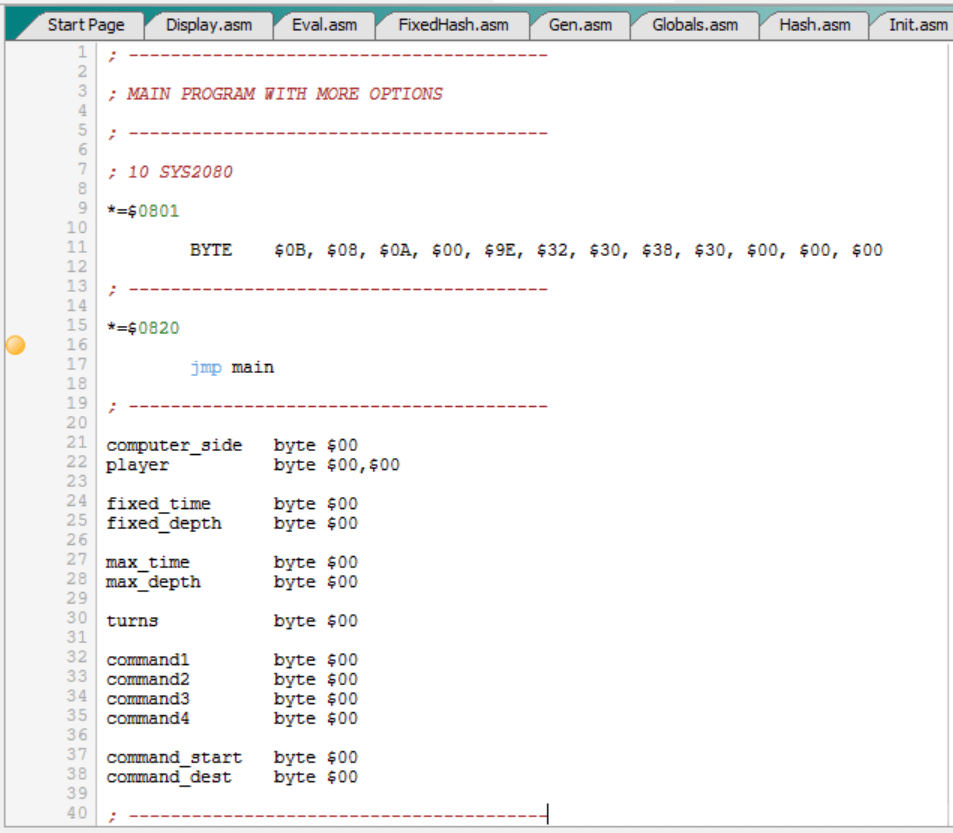 - “computer_side”: Permite parar el motor de juego (computer_side = #PIECE_EMPTY), arrancarlo para que el C64 juegue por el ratón (computer_side = #SIDE_MOUSE), y arrancarlo para que el C64 juegue por los gatos (computer_side = #SIDE_CATS).