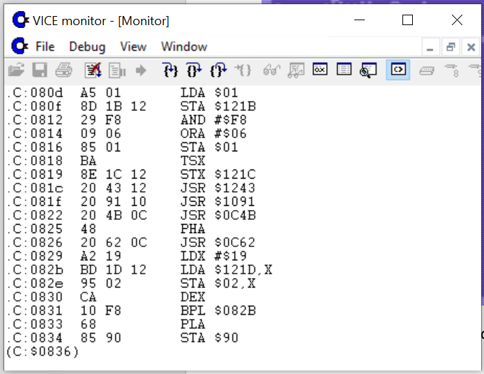 Y si desensamblamos a partir de la dirección $080d vemos el comienzo del programa en código máquina que se está ejecutando: