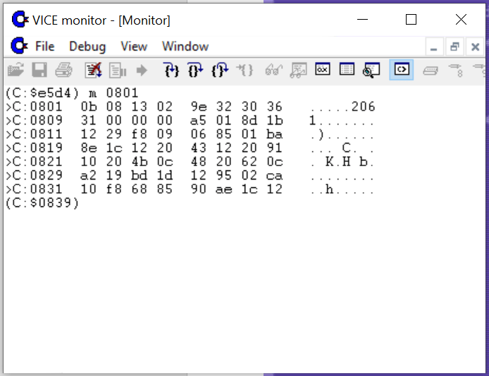 Y si entramos en el monitor de VICE con ALT + M y vemos el contenido de la memoria a partir de la dirección $0801 vemos el contenido esperado (el mismo que ya vimos en HxD):