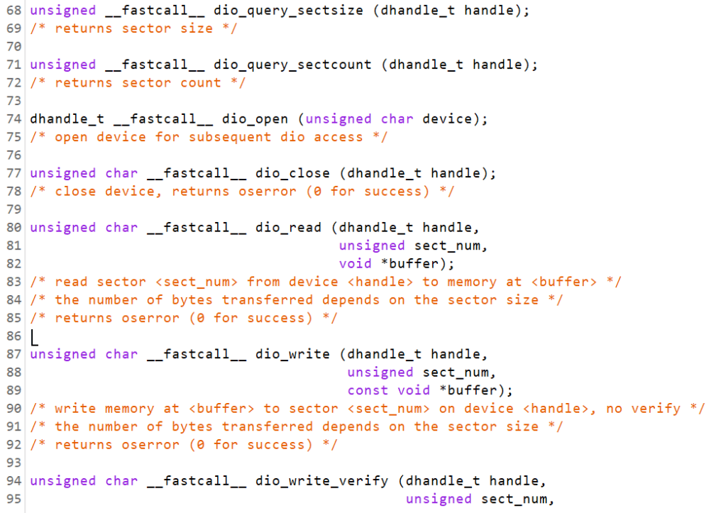 Como vemos, efectivamente se trata de un API de “bajo nivel”, puesto que la abstracción más compleja que se maneja es el “sector”. En ningún momento el API maneja el concepto de “fichero”.
