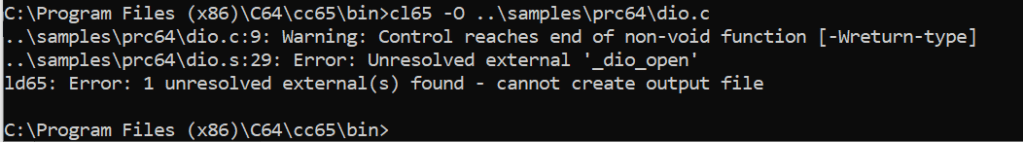 En definitiva, la distribución de cc65, al menos la que tengo yo, no trae soporte para dio en el C64. Otra forma de confirmar esto mismo es revisando el fichero “readme.txt” del directorio cc65\samples: