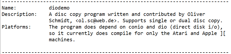 En este fichero se afirma que el programa de ejemplo “diodemo.c”, que se apoya en conio y dio, sólo está disponible para Atari y Apple II.