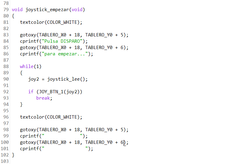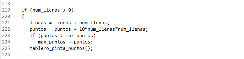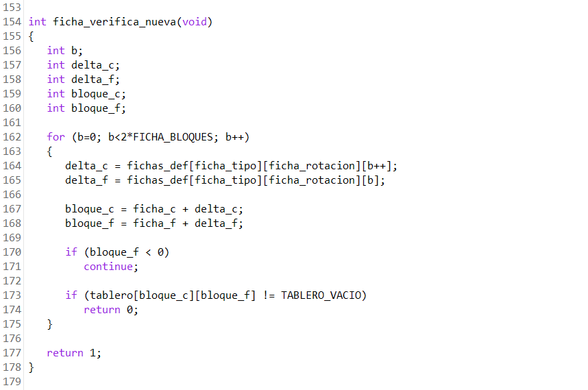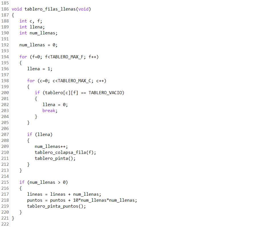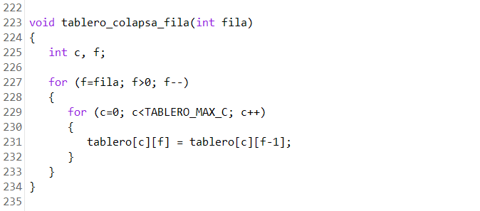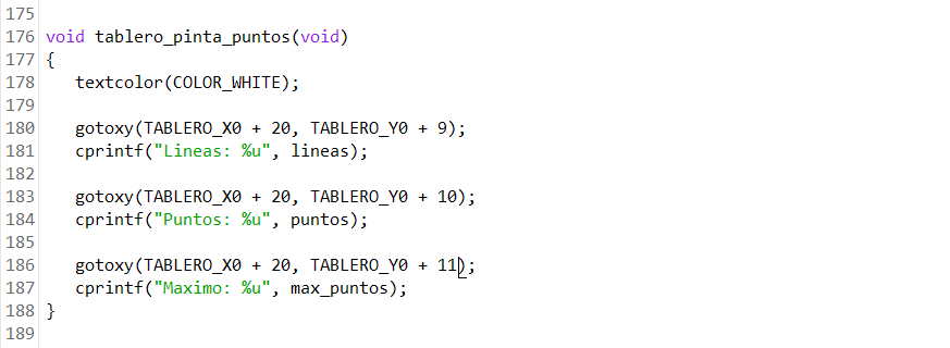 De hecho, tablero_pinta() es la función estrella, ya que se encarga de pintar el tablero en pantalla (sin la ficha activa que se maneja y pinta aparte). En el fondo, es fácil; se trata de recorrer la matriz del tablero por columnas y filas y pintar espacios allí donde el tablero está vacío (el espacio no necesita un color, porque el espacio es transparente) y un cuadrado allí donde hay una ficha o bloque (el bloque sí necesita color):