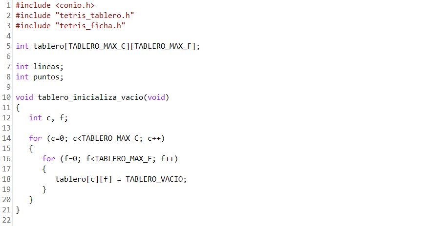 Por lo demás, en tetris_tablero.h también tenemos los prototipos de las funciones, que lógicamente se implementan en tetris_tablero.c. Respecto a éstas, la función tablero_inicializa_vacio() inicializa el tablero vacío, lo cual será lo normal, y tablero_inicializa_contenido() lo inicializa con fichas de tipos variados, lo cual nos servirá para probar que otras funciones como tablero_pinta() funcionan bien.