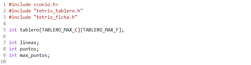 En el fichero tetris_tablero.h tenemos la definición de constantes importantes, como el tamaño del tablero (TABLERO_MAX_F y TABLERO_MAX_C), la posición del tablero respecto a la pantalla (TABLERO_X0 y TABLERO_Y0), es decir, dónde se va a empezar a pintar el tablero dentro de la pantalla, y cómo vamos a codificar las posiciones vacías (TABLERO_VACIO).
