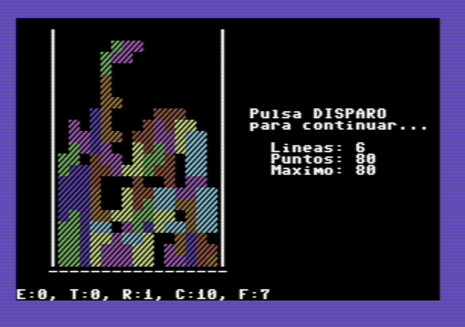 También es interesante observar que vamos a separar claramente entre las estructuras de datos para guardar la información de la ficha activa y el tablero, y la pantalla y su memoria ($0400 – $07e7). Es decir, el juego controlará el tipo de ficha, su rotación, su posición y el contenido del tablero mediante unas estructuras de datos en memoria, y luego pintará esa información a pantalla cuando sea necesario, pero ambas informaciones, variables y pantalla, no van a estar mezcladas ni van a ser la misma.