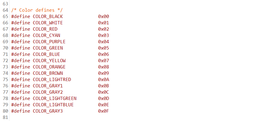 Si recordamos, la paleta de colores del C64 la tenemos en el header file c64.h: