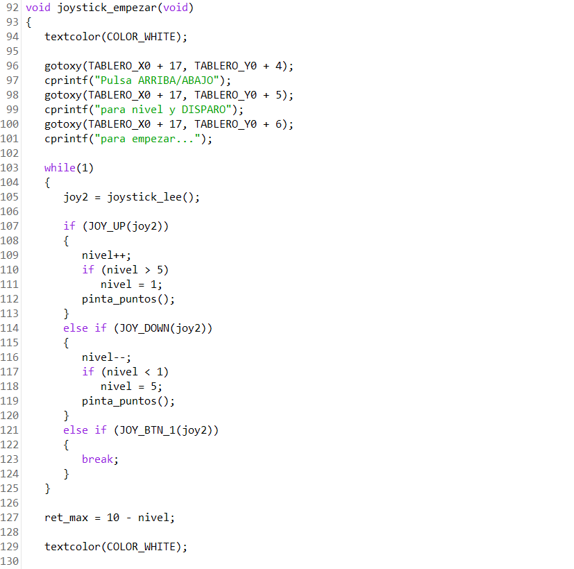Ahora, además de pulsar disparo para empezar el juego, el jugador podrá mover el joystick arriba para subir el nivel (hasta 5) o abajo para bajarlo (hasta 1). Posteriormente, el retardo (nueva variable ret_max) se define como: