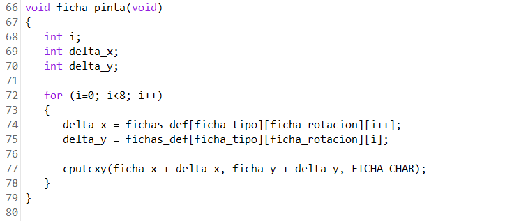 De este modo, al pintar una ficha con ficha_pinta() o borrarla con ficha_borra(), no sólo tenemos que tener en cuenta la rotación y recorrer los cuatro bloques activos, sino también tener en cuenta el tipo de ficha: